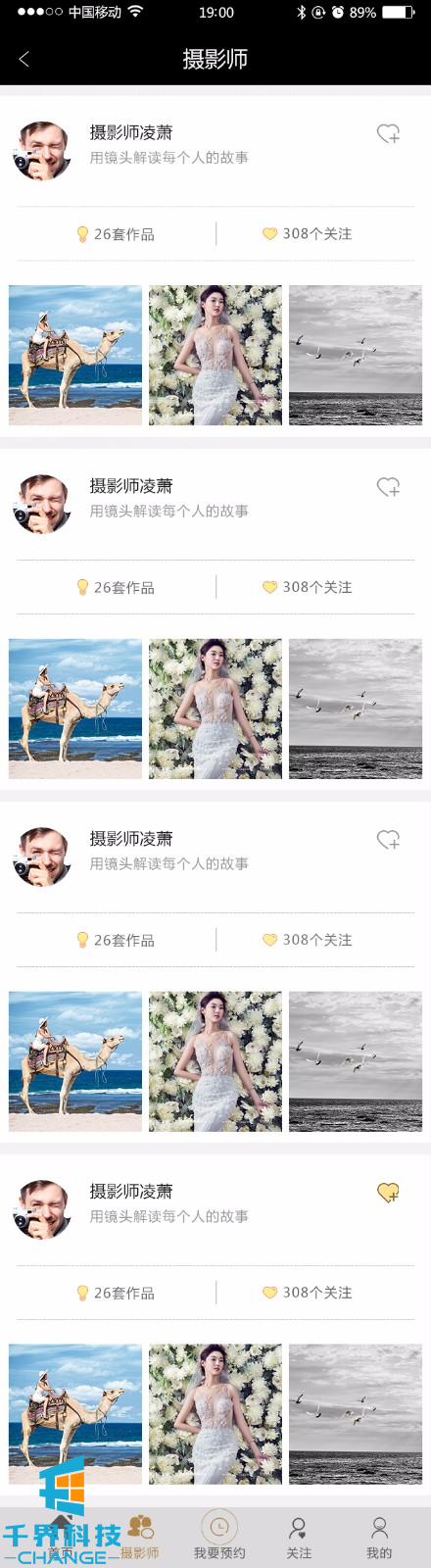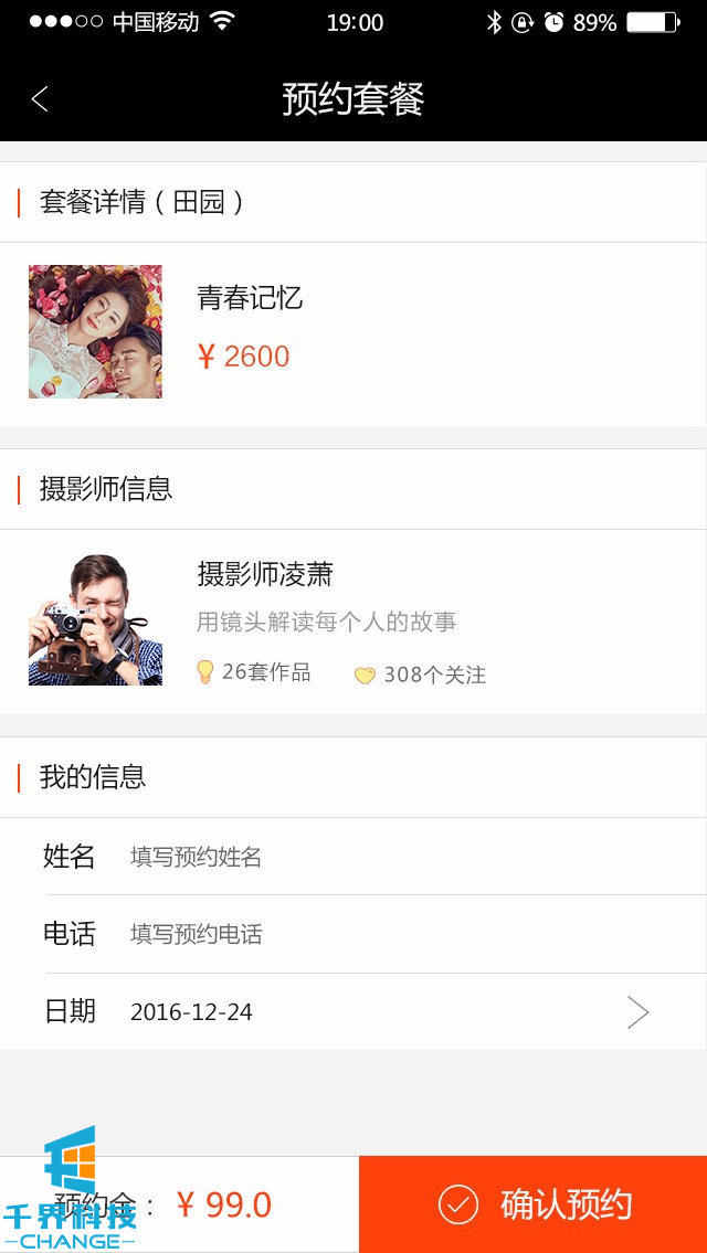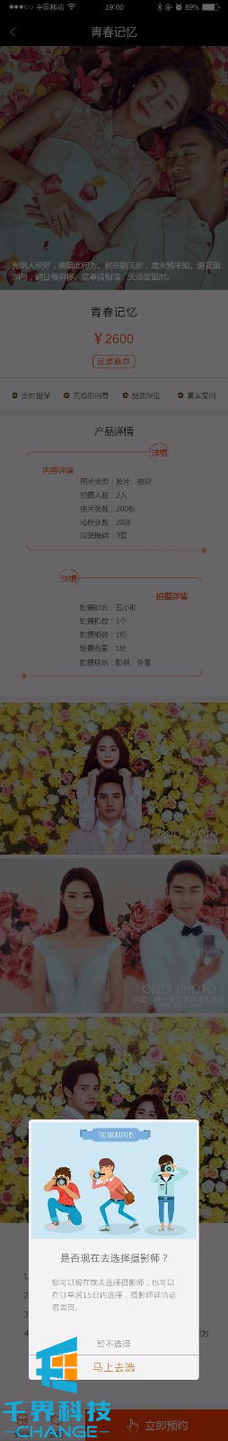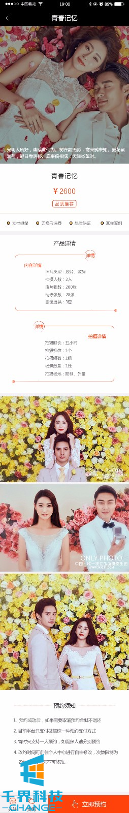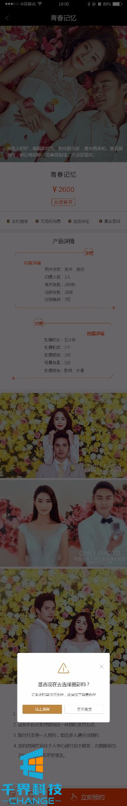 該平臺是一個多商家的攝影行業預約平臺,包含套餐分類、套餐預約購買、攝影師預約、預約拍照時間,攝影師作品展示,關注人數等攝影預約平臺。