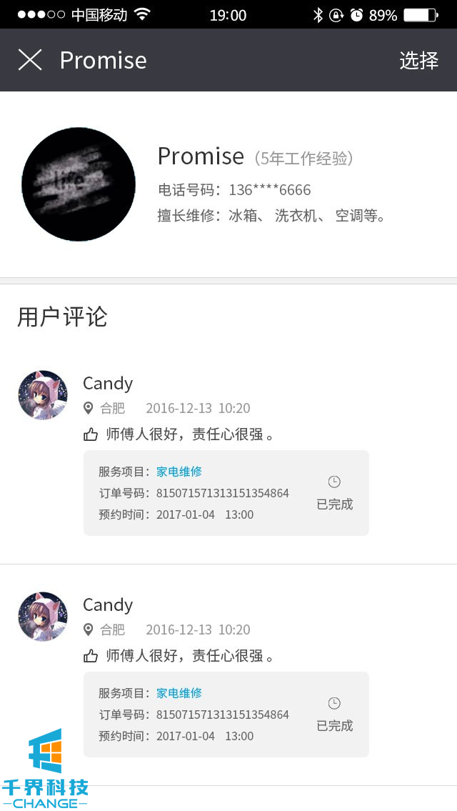 該項目是維修行業預約下單平臺,分為師傅端和用戶端,用戶可查看師傅信息,可以在線約師傅