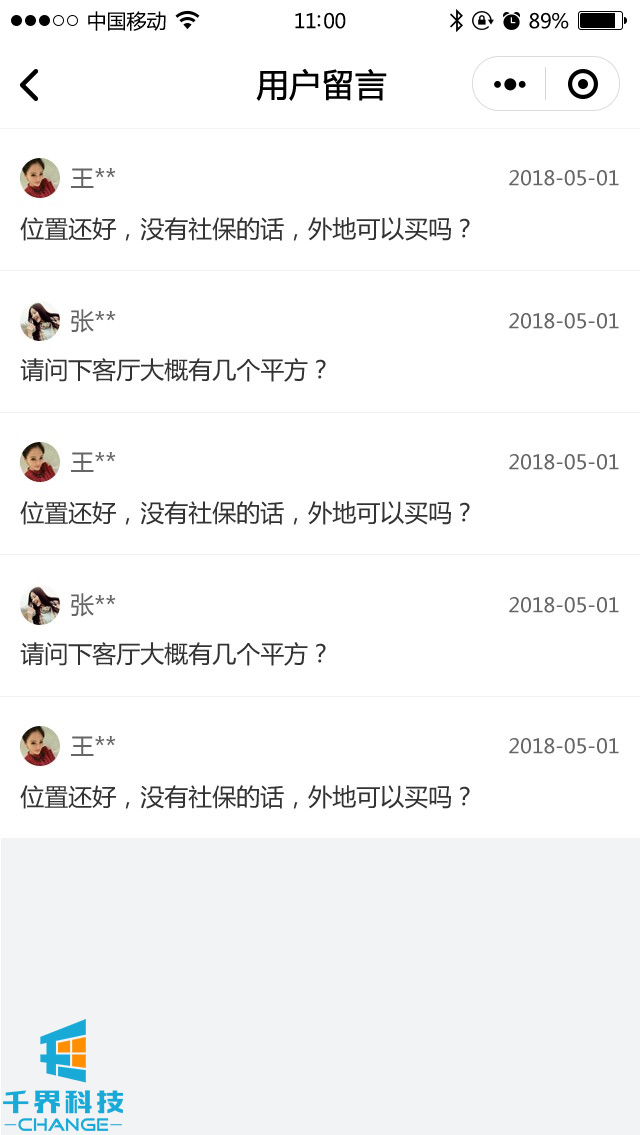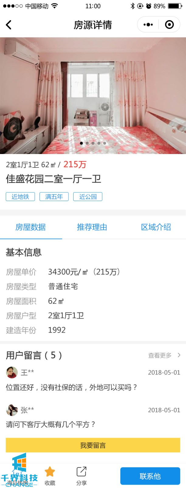 該項目是一個房源信息展示的小程序,里面包含房源展示,條件篩選,房源分類,在線問答,用戶留言等功能
