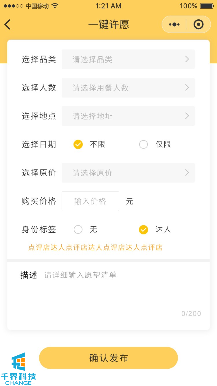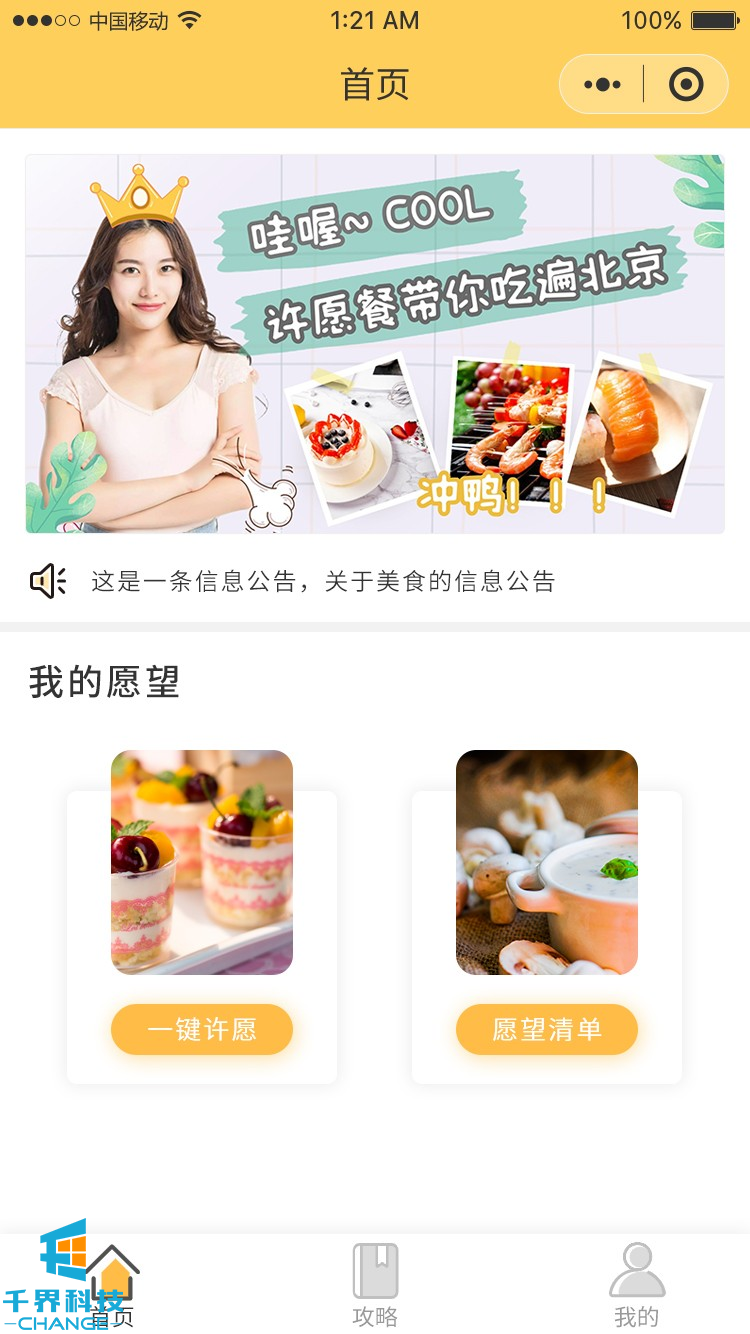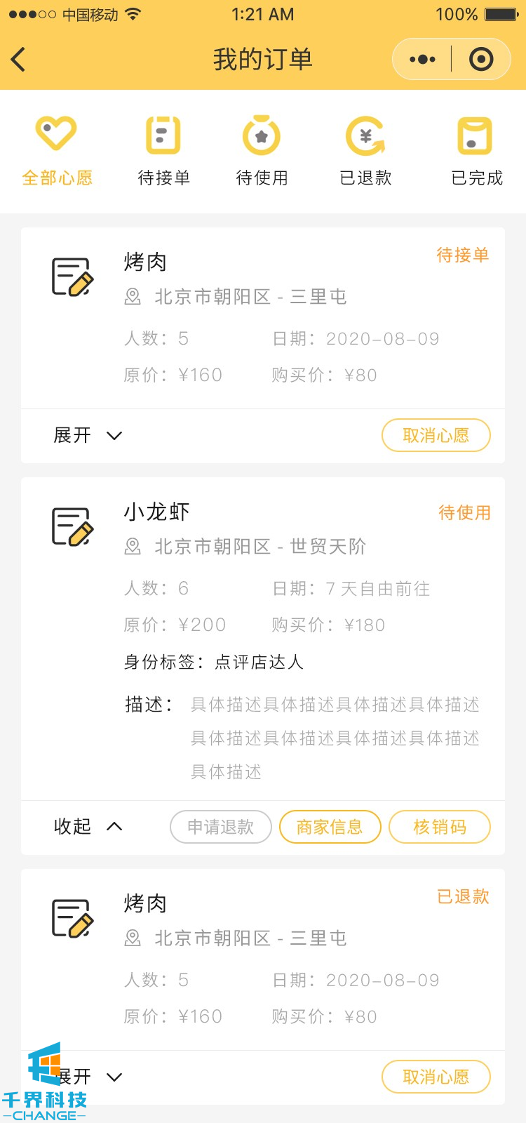 該項目是一個許愿餐小程序,主要功能有用戶發(fā)起愿望清單,商家端可以搶單接單,用戶去實體店核銷等功能
