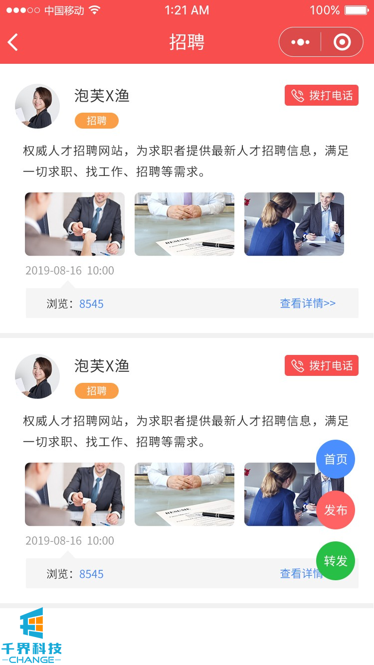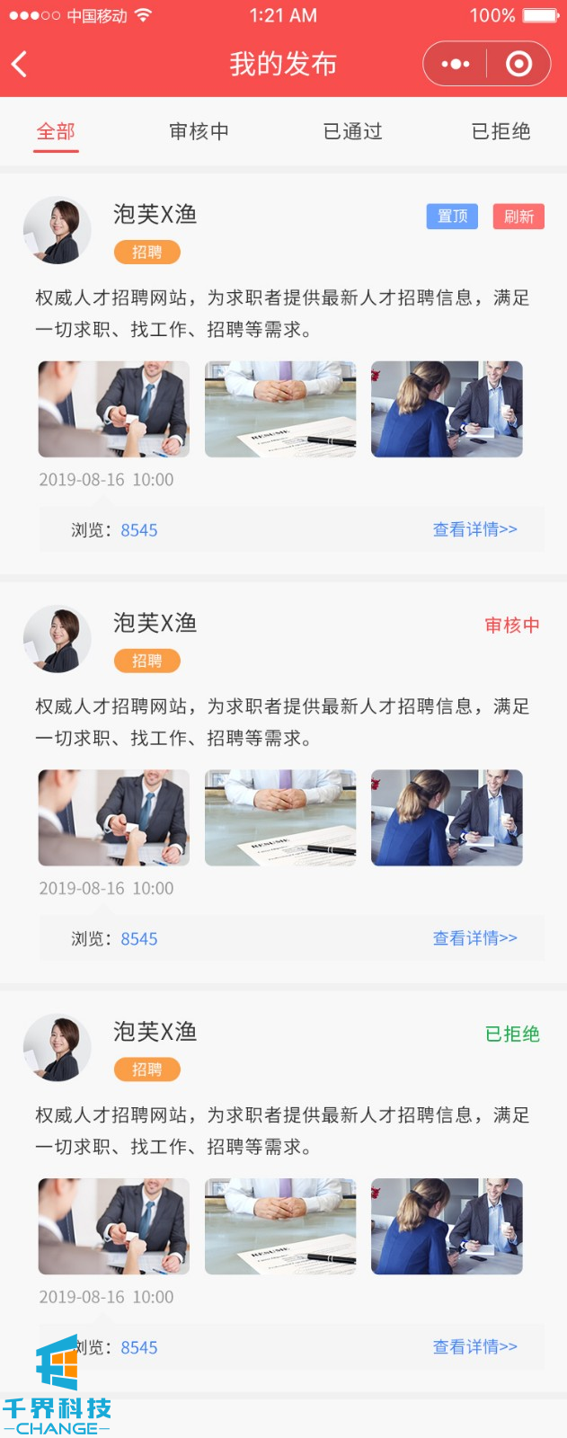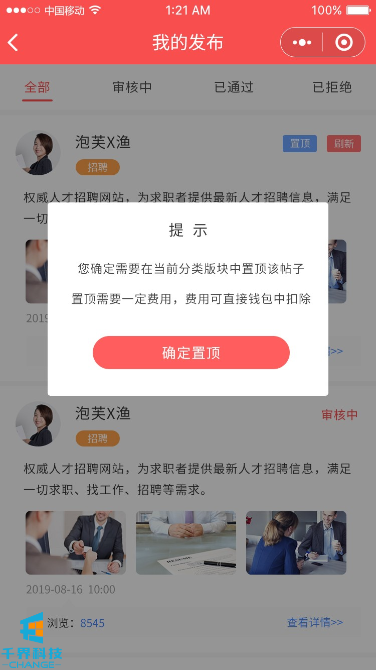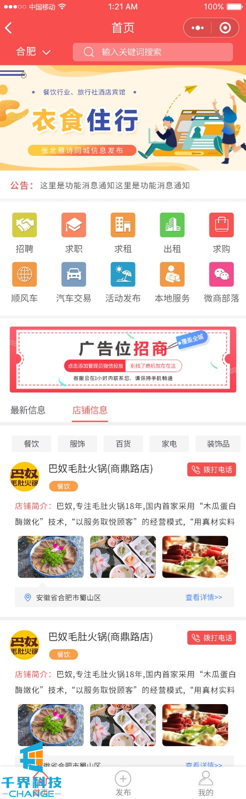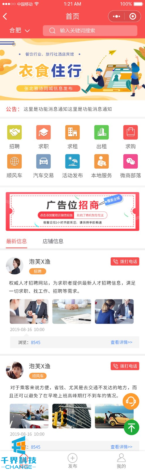同城信息服務站小程序主要功能有用戶發布需求、店鋪入駐展示店家信息、針對已發帖子付費刷新置頂帖子等功能