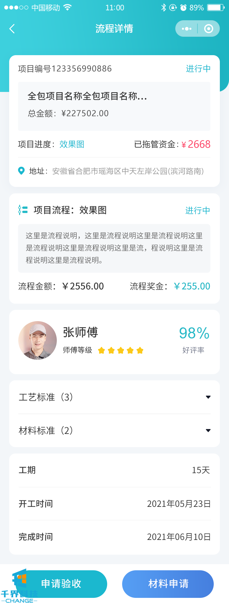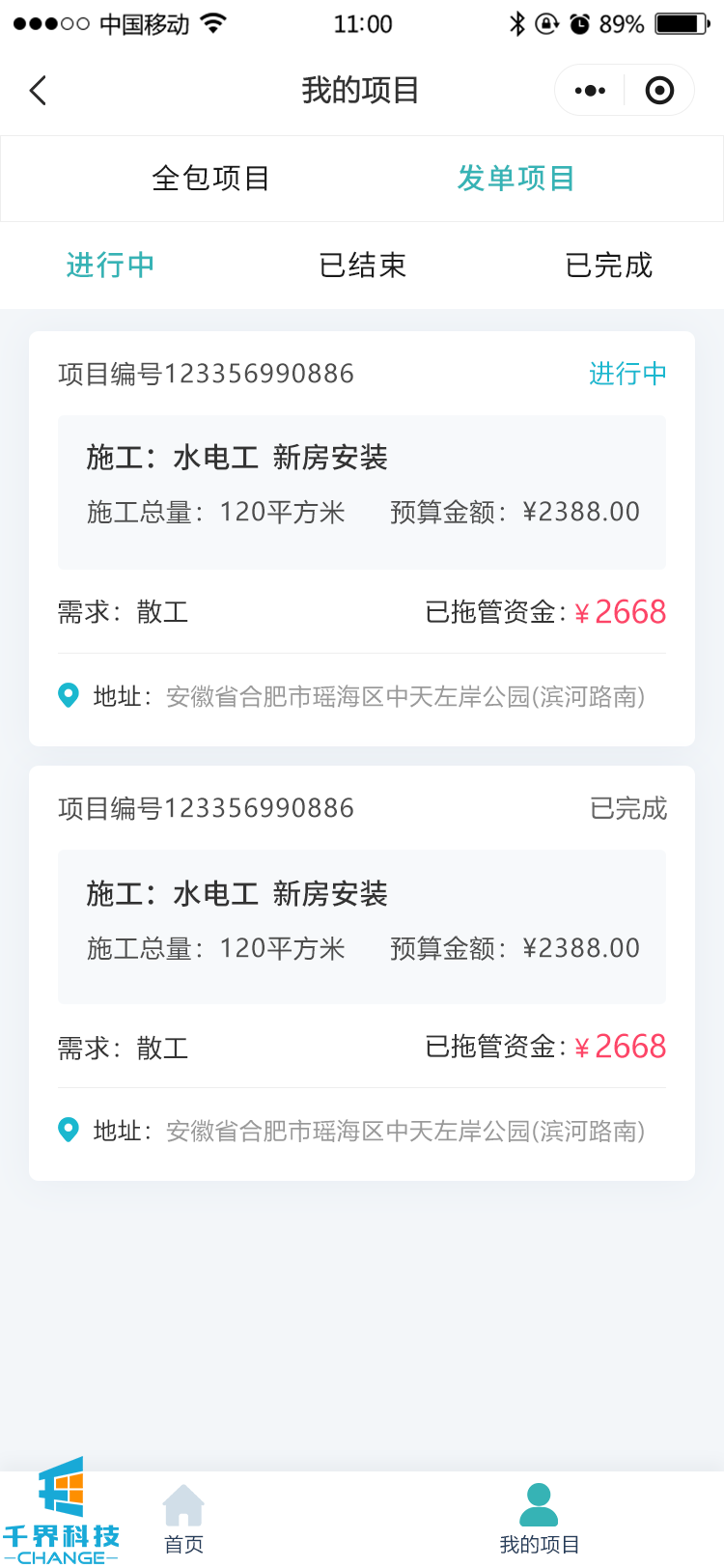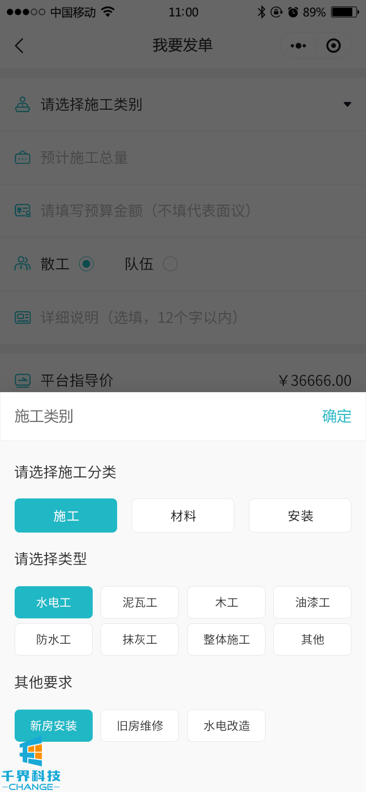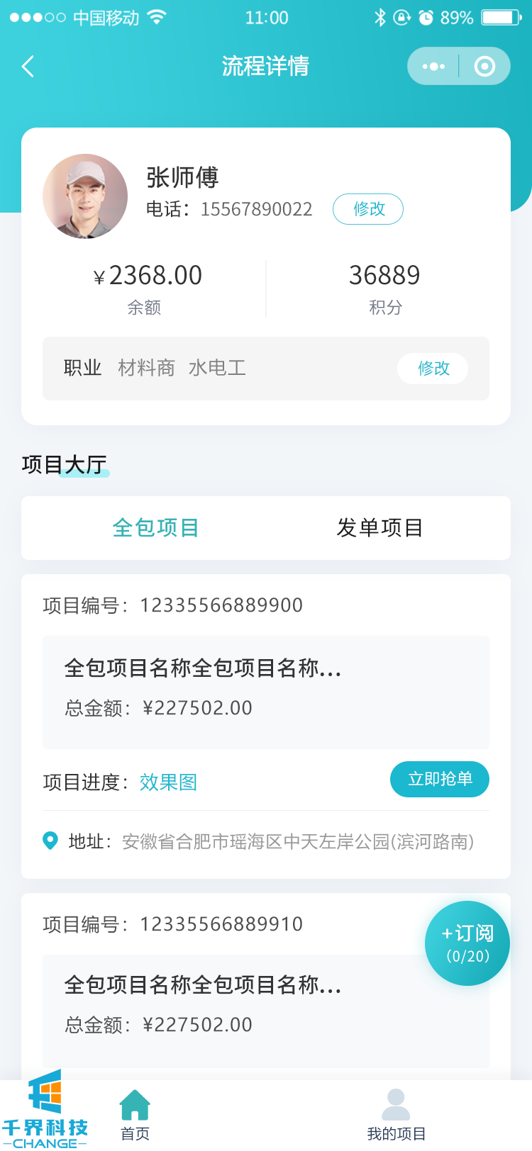 該項目一個家裝小程序,平臺有分包和整包,分包是用戶在前端下單,對應的師傅進行接單,整包是后臺進行發包,每個節點的師傅相應的報名接單