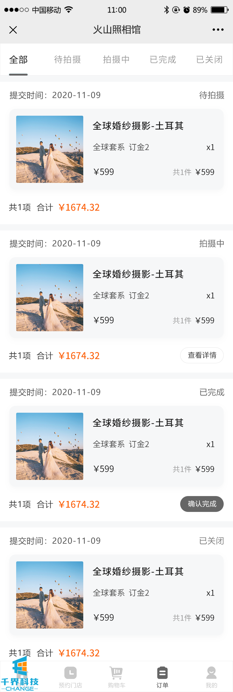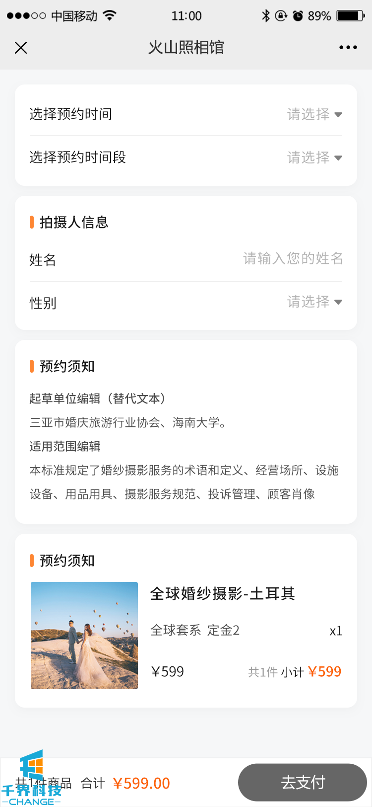 該項目是一個單門店的攝影預約公眾號,主要功能有用戶可以在公眾號預約攝影套餐,后臺接單安排線下預約攝影。后臺有預約排期管理等功能。