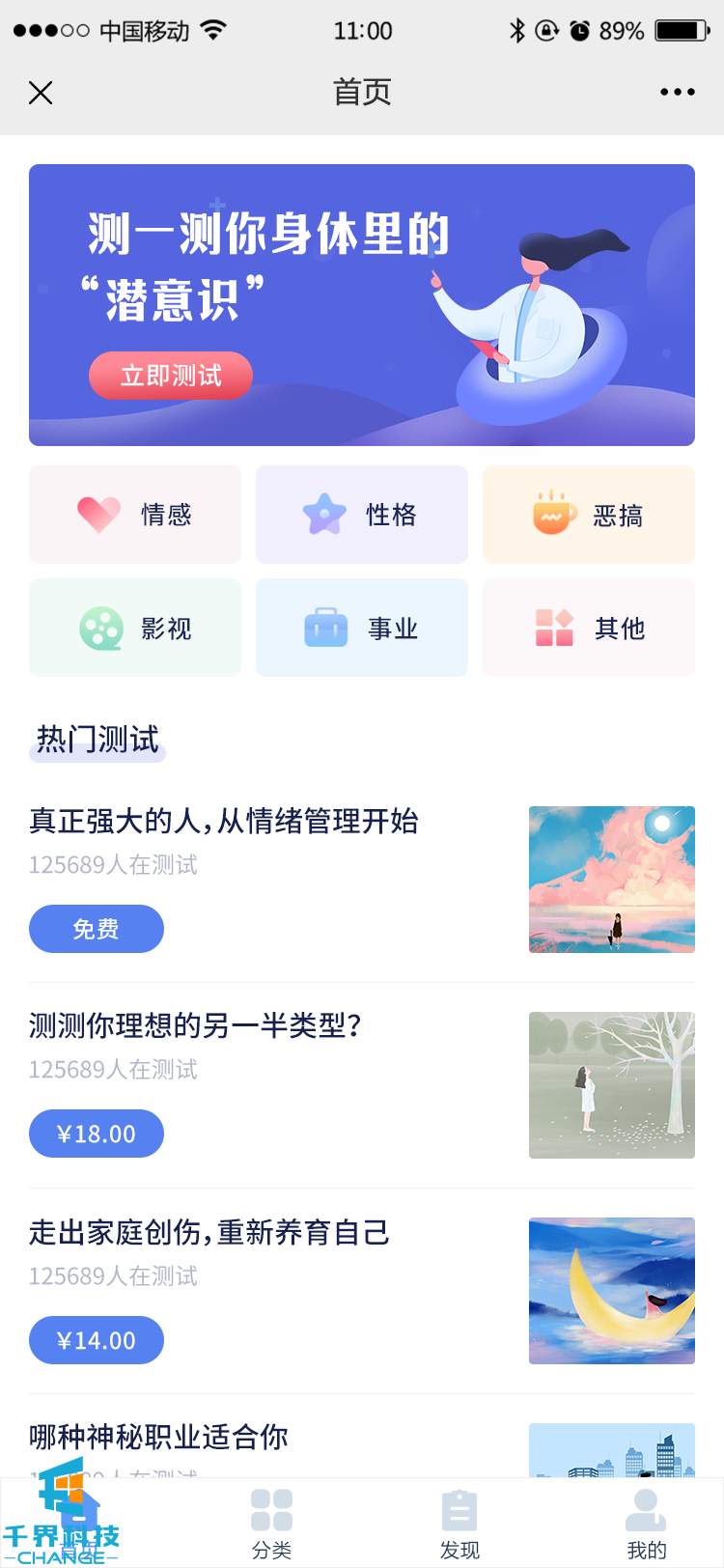 該項目是一個人身問題測試,人身問題分析,通過答題的形式,系統(tǒng)根據(jù)答題結(jié)果匹配對應(yīng)的分析結(jié)果。項目主要分為熱門項目測試,所有項目分類,資訊版塊,個人信息以及測試結(jié)果。