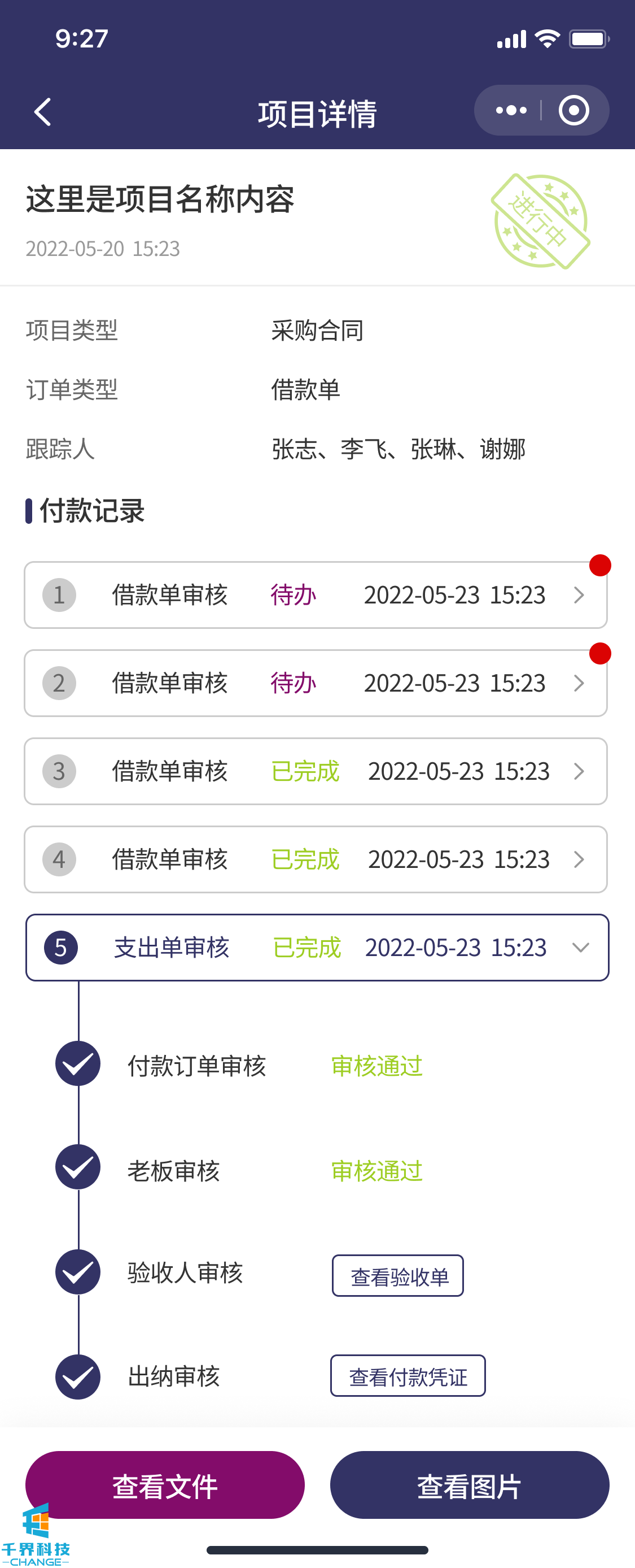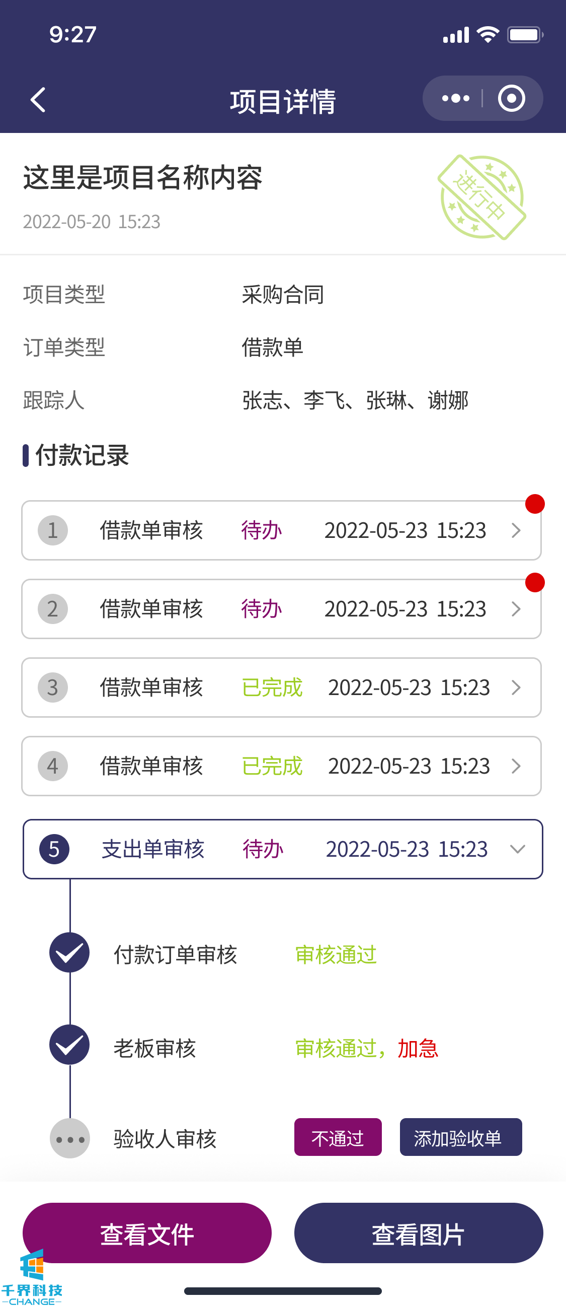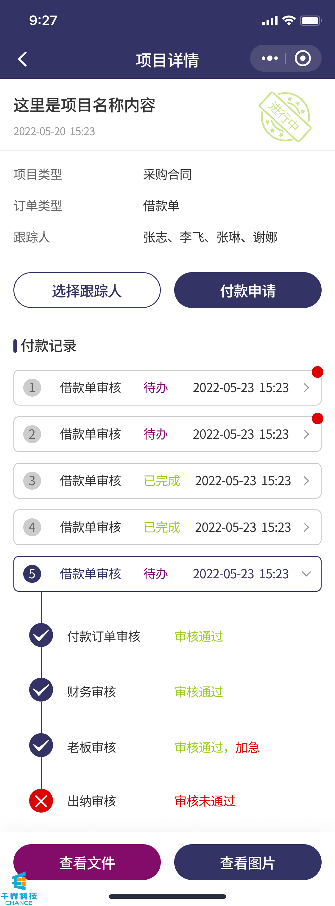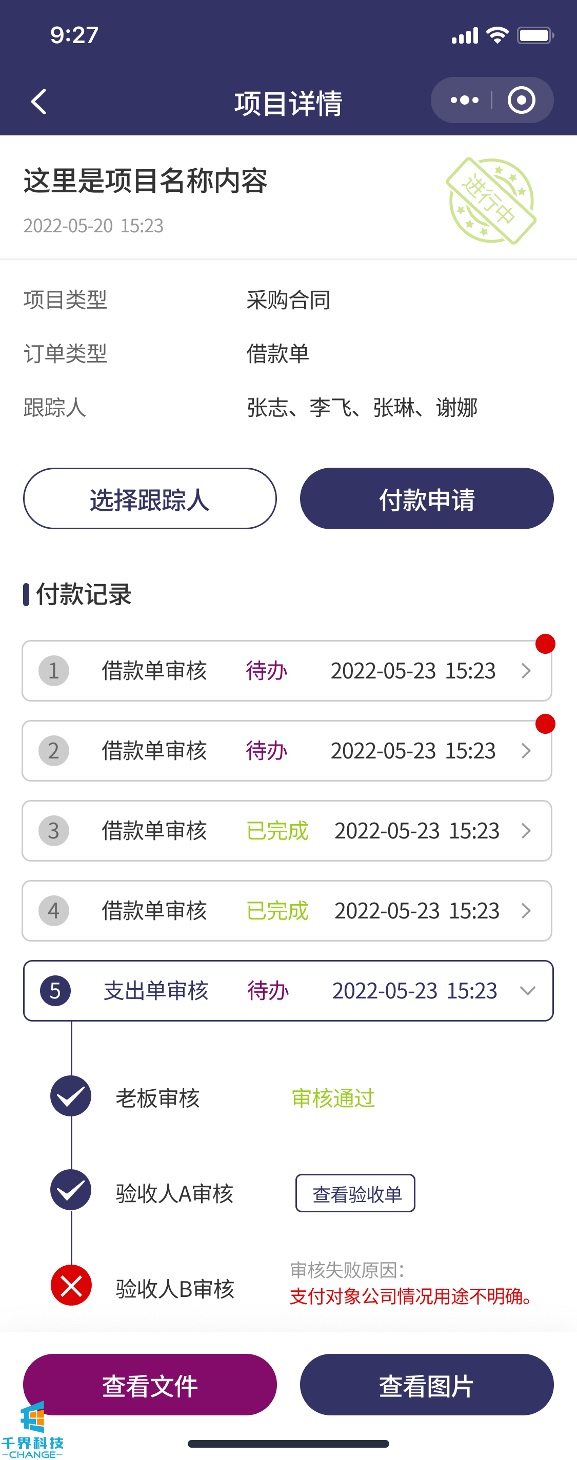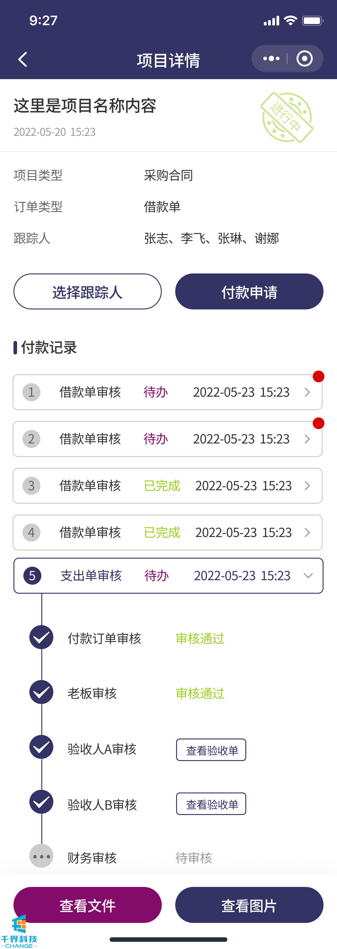 該項目是一個解決企業內部付款審批流程的線上程序。包含了負責人,法務,領導,驗收人員,財務,出納。根據設定的流程依次審批。可以實現多合同,多次付款審批,每次付款記錄多角色審核明細等