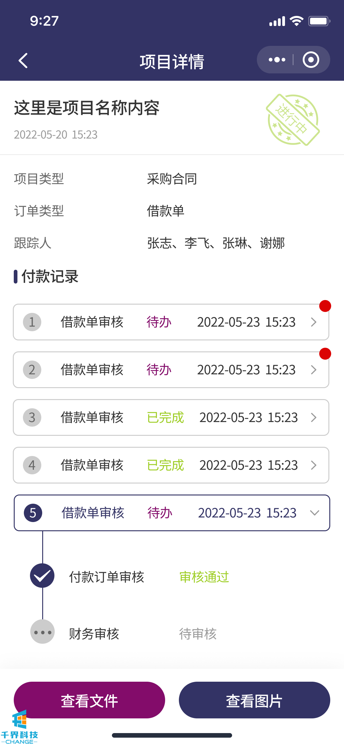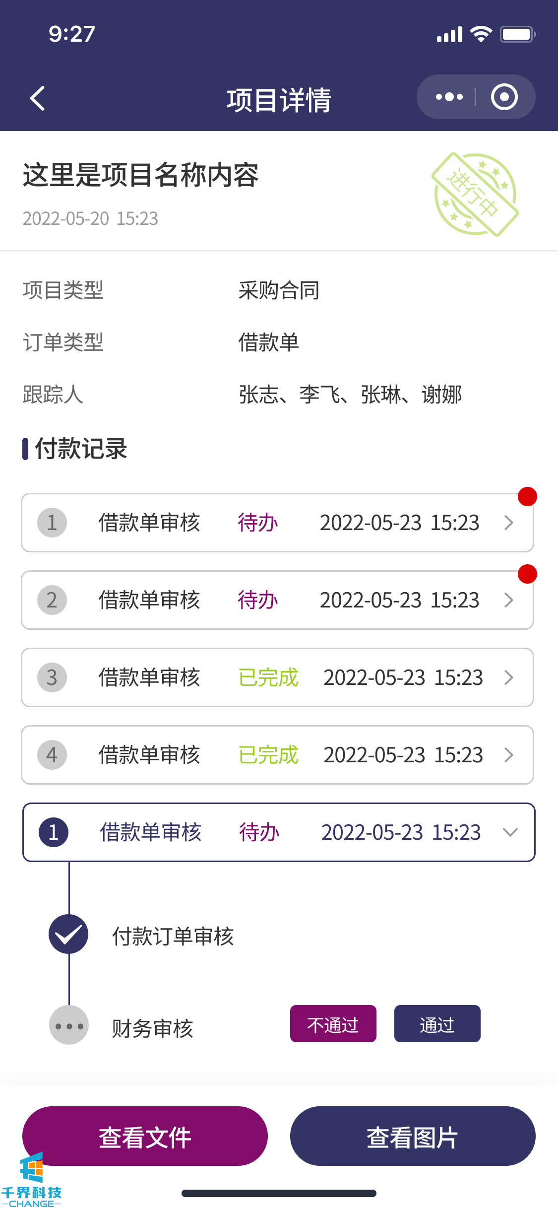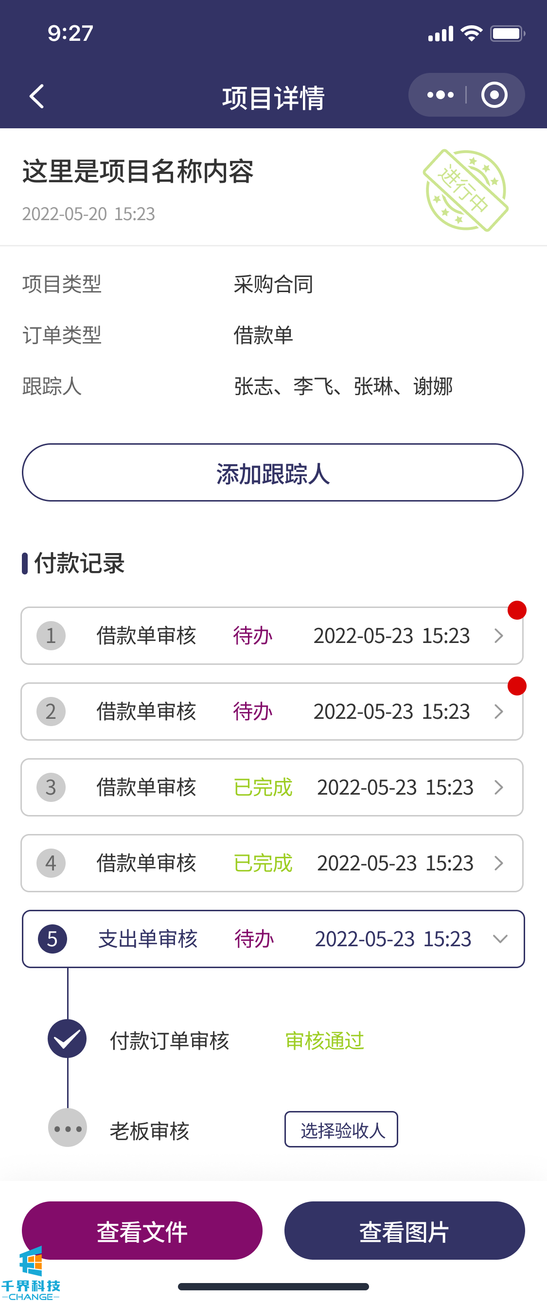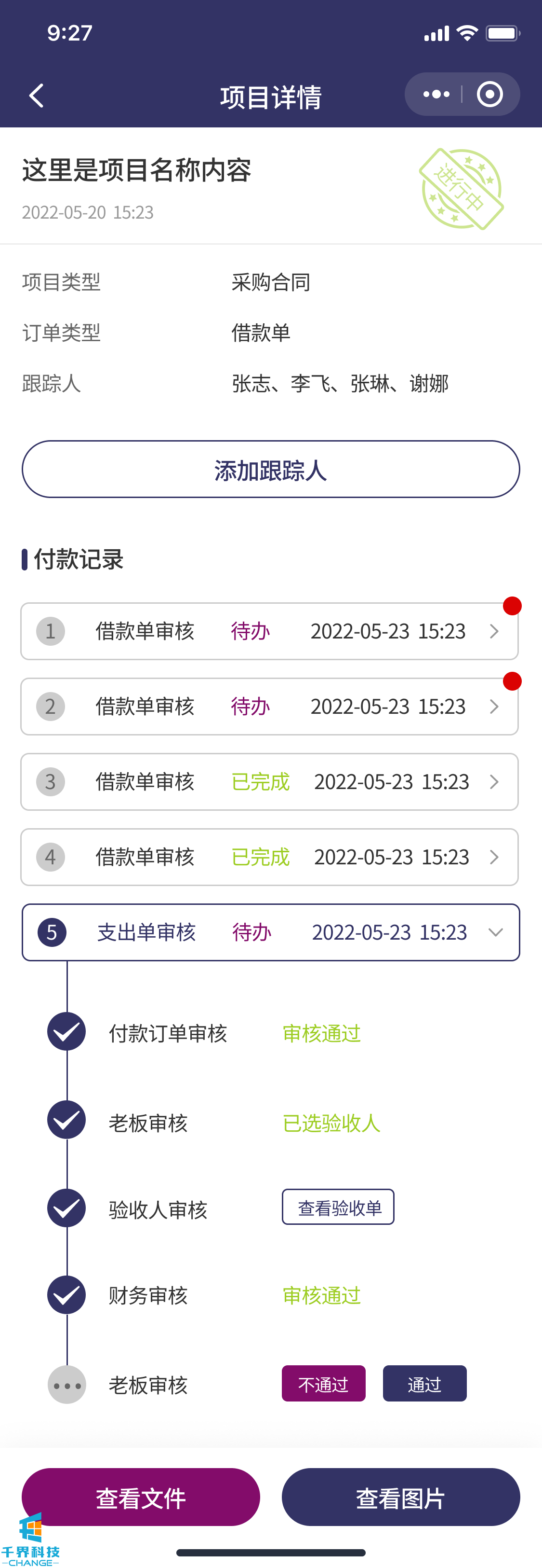 該項目是一個解決企業內部付款審批流程的線上程序。包含了負責人,法務,領導,驗收人員,財務,出納。根據設定的流程依次審批。可以實現多合同,多次付款審批,每次付款記錄多角色審核明細等