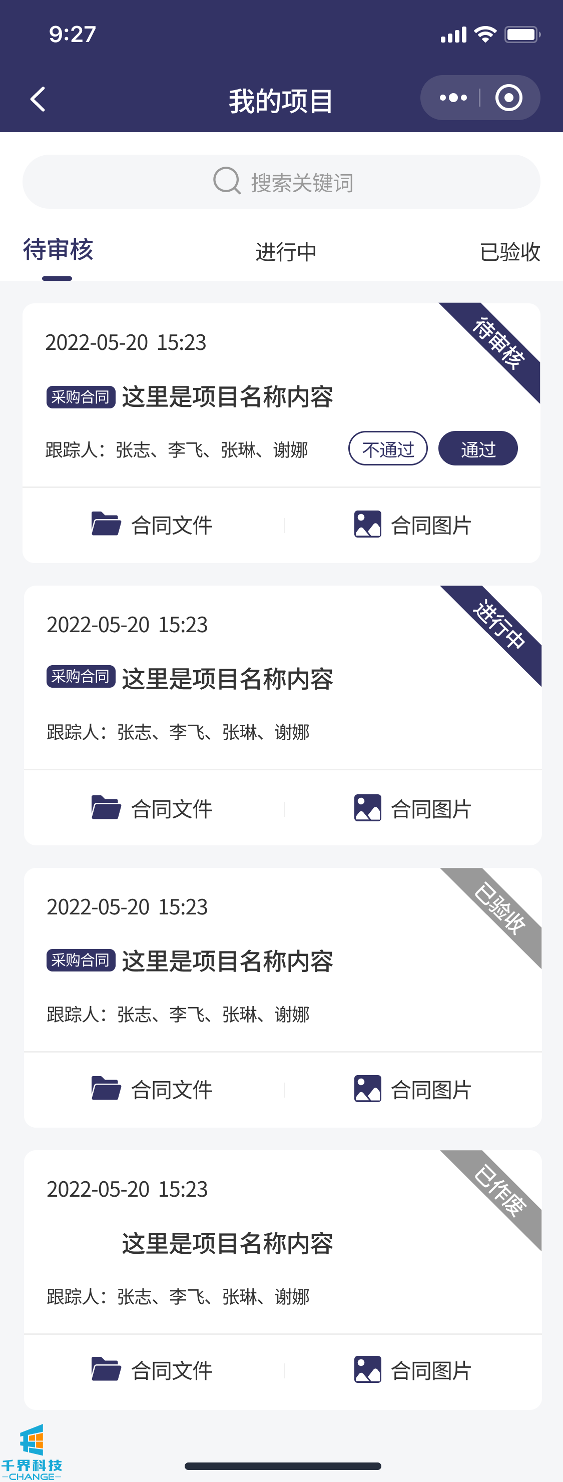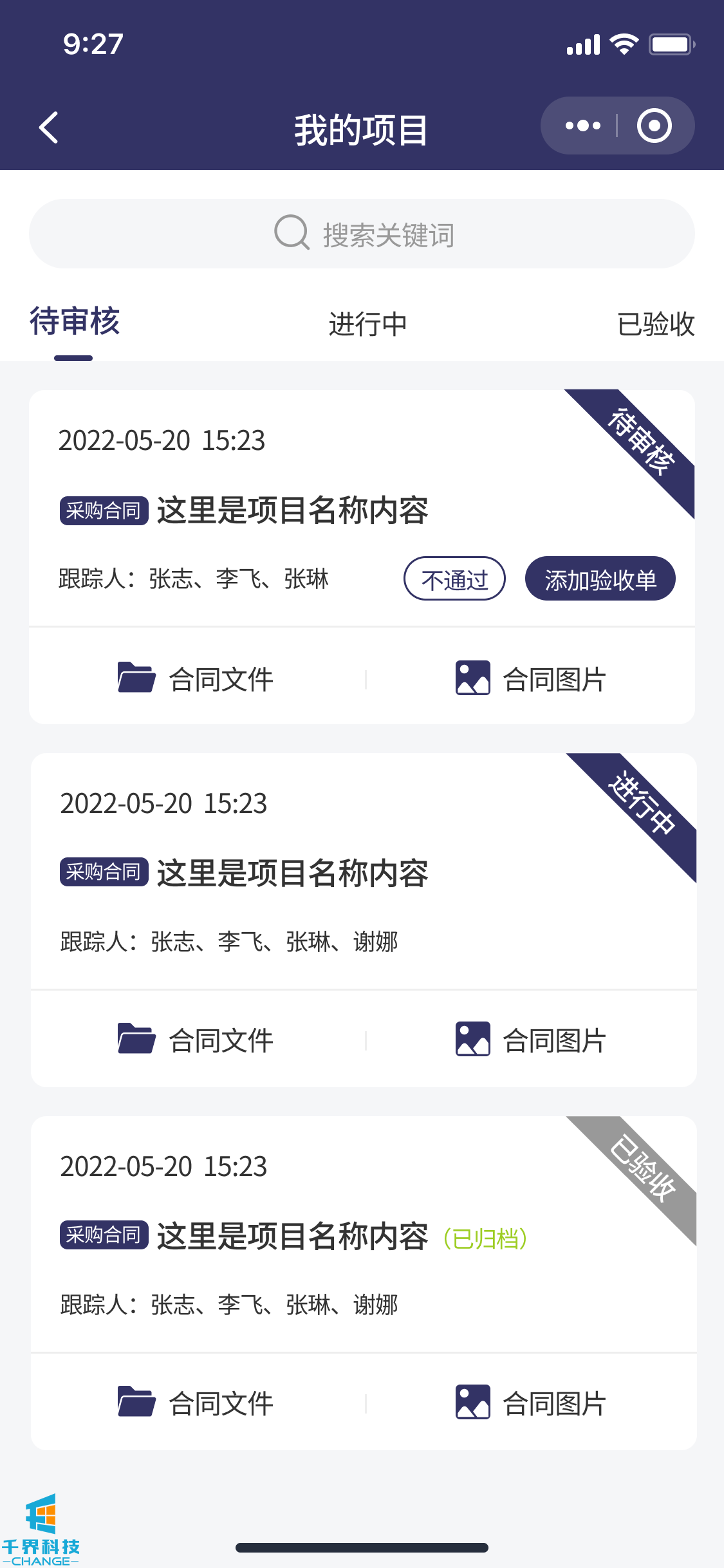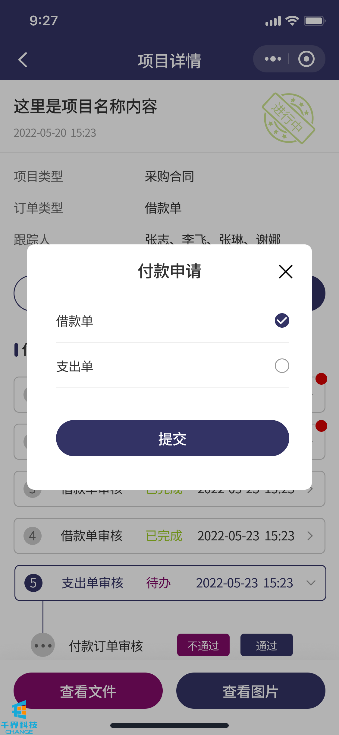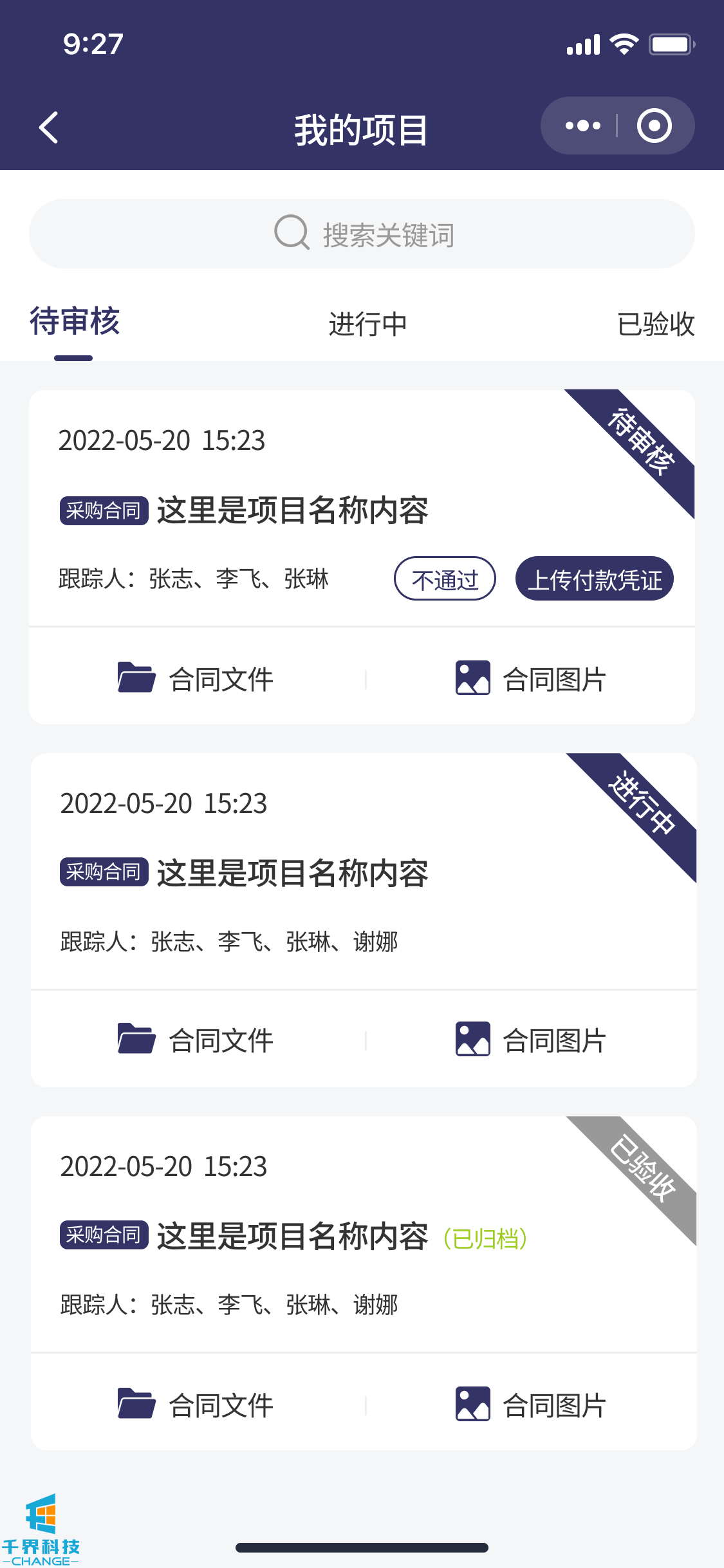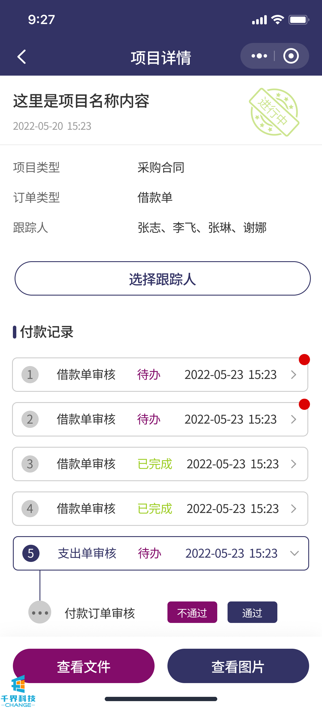 該項目是一個解決企業內部付款審批流程的線上程序。包含了負責人,法務,領導,驗收人員,財務,出納。根據設定的流程依次審批。可以實現多合同,多次付款審批,每次付款記錄多角色審核明細等