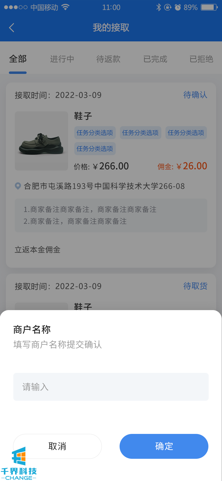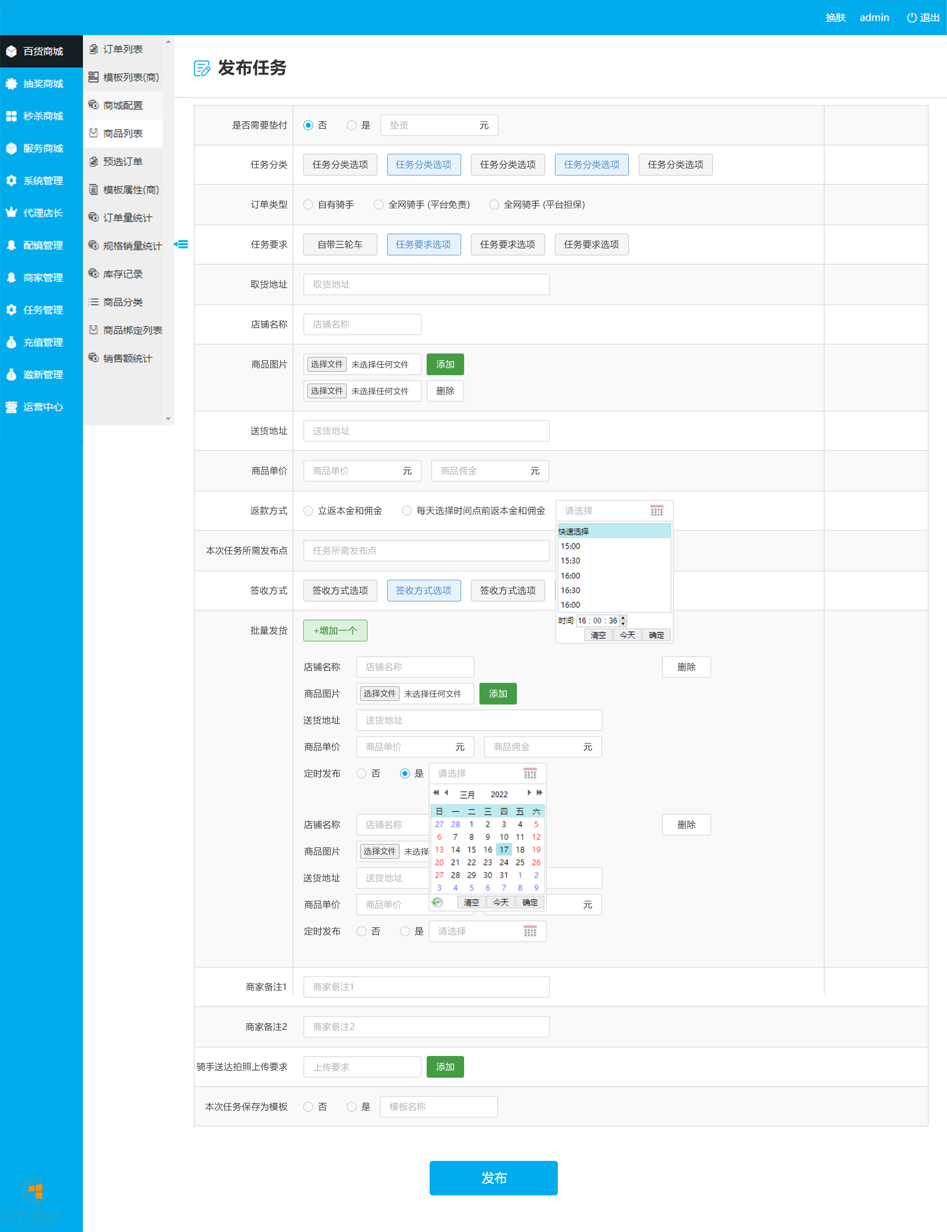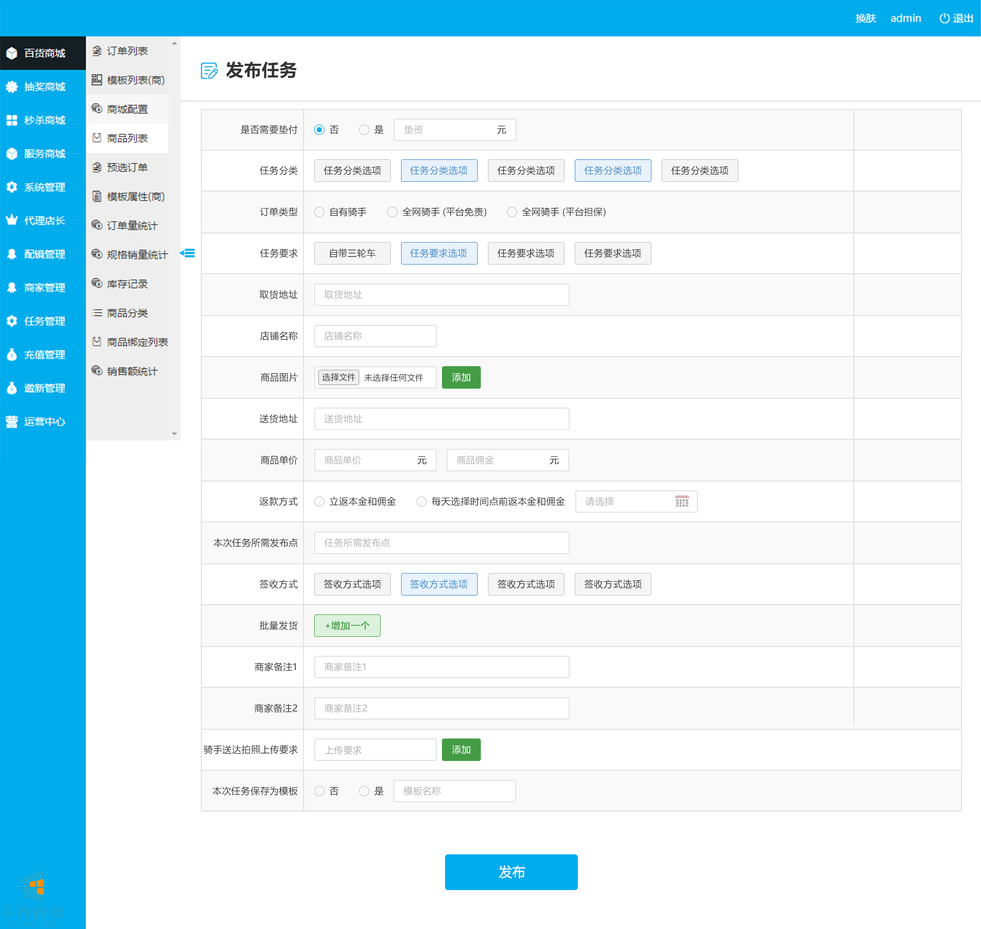 該項目是商家通過PC后臺發布跑腿任務,由師傅接單后進行送貨,線上無交易,商家發布需要消耗對應的平臺通用貨幣