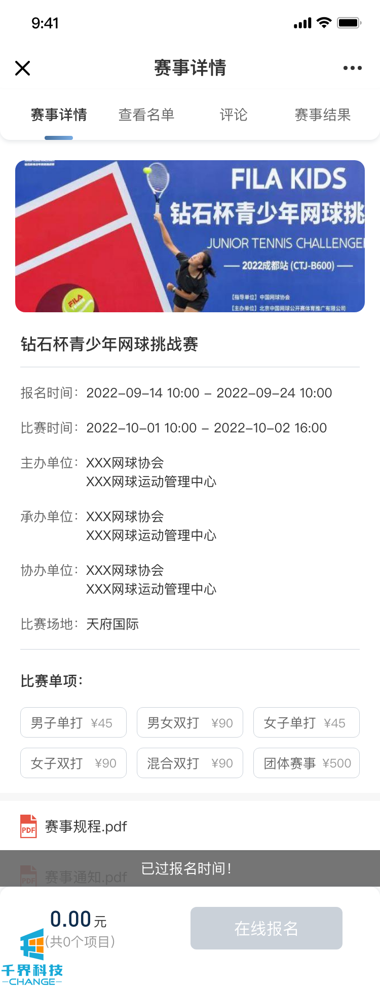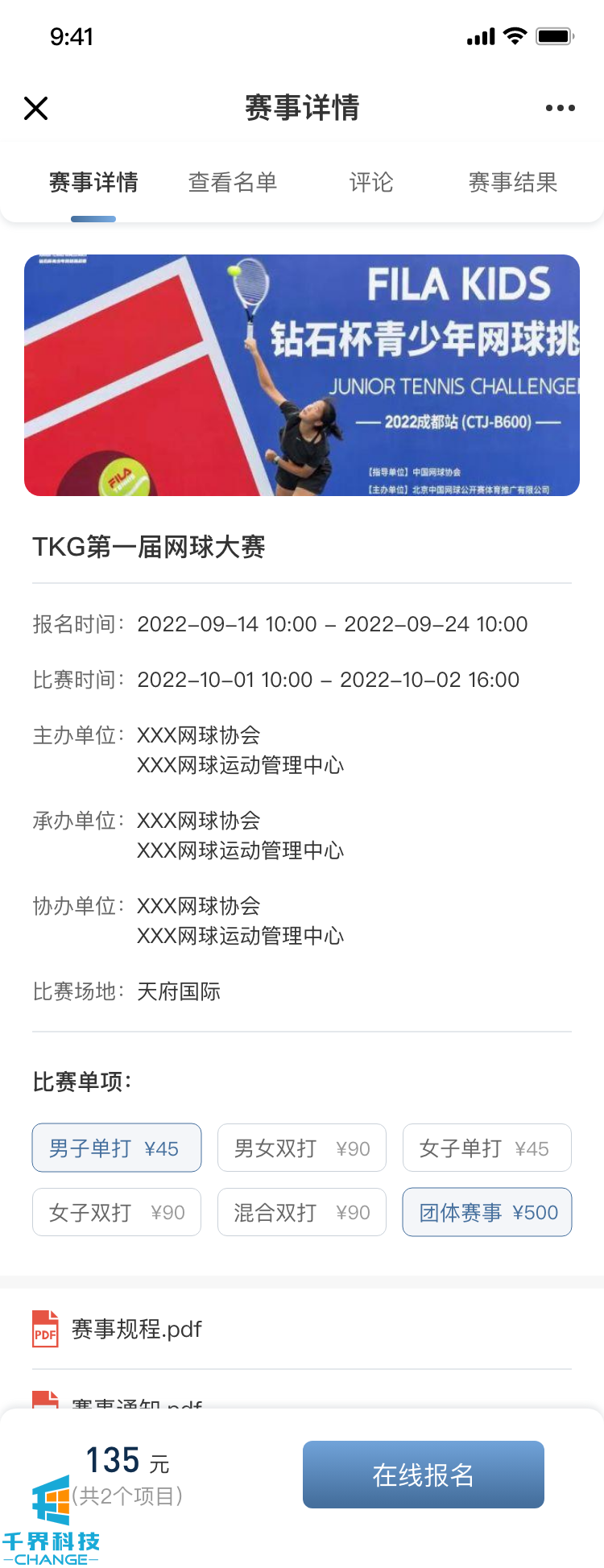 客戶做一個(gè)網(wǎng)球賽事報(bào)名的模塊,用戶線上可以選擇報(bào)名參加的網(wǎng)球賽事、項(xiàng)目,填寫相關(guān)信息,下載比賽資料,查看比賽結(jié)果等功能