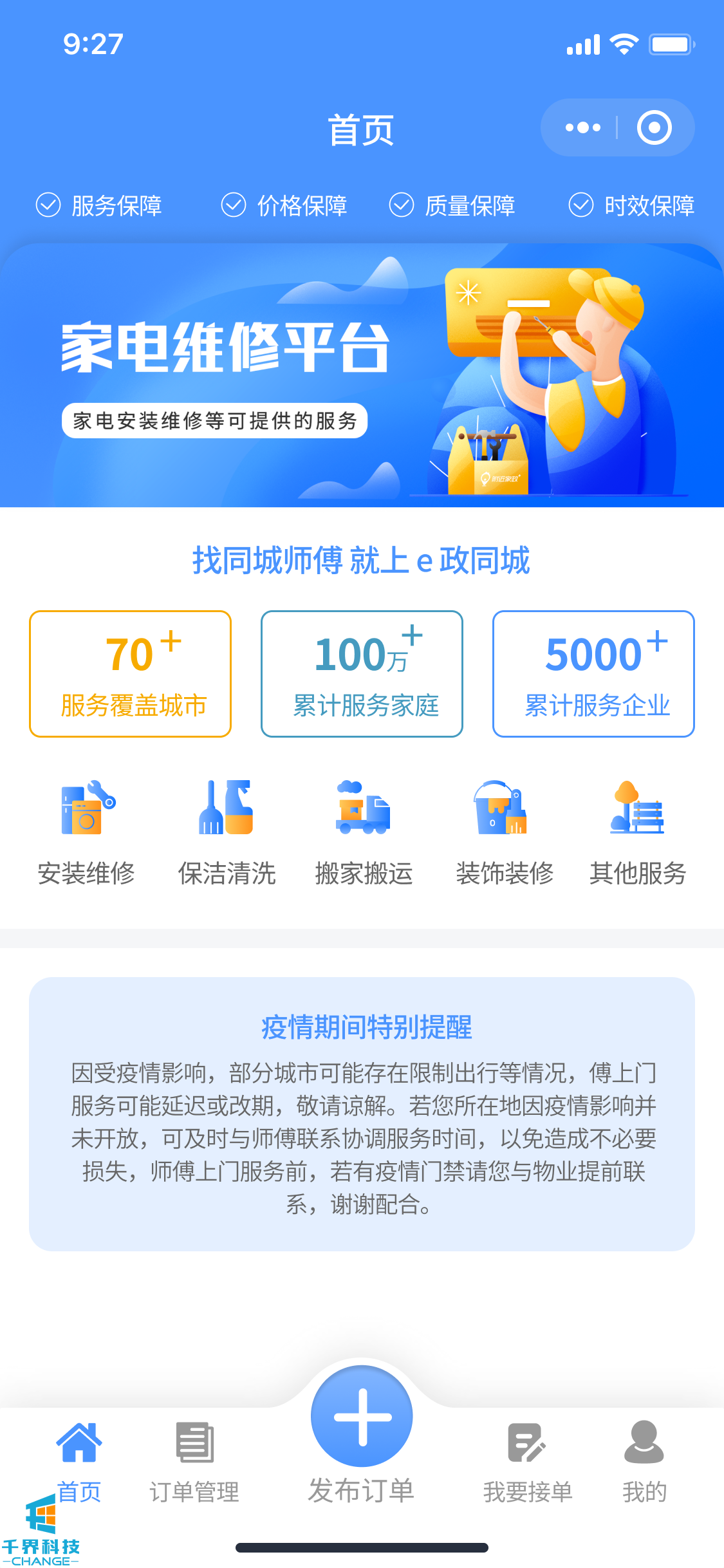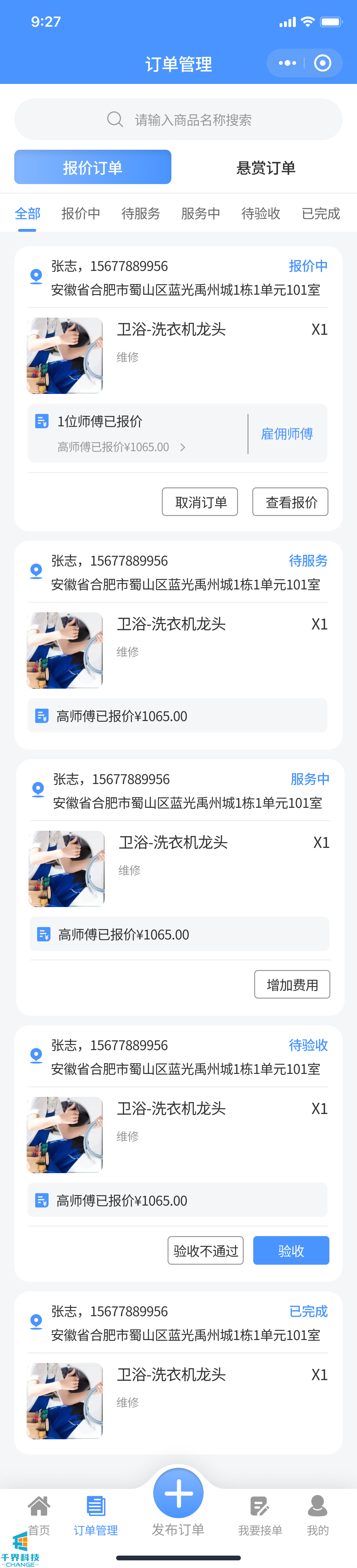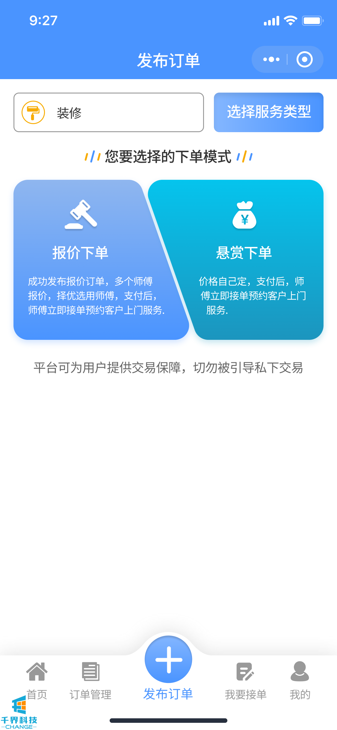 該項目是一個多城市地區的服務眾包平臺,用戶可以通過該小程序發布一些家政、維修等相關任務,任務發布有兩種形式一種是讓師傅報價一種是自己報價讓師傅接單。師傅端可以通過小程序進行接單或報價。其中帶有對應的分銷邏輯。