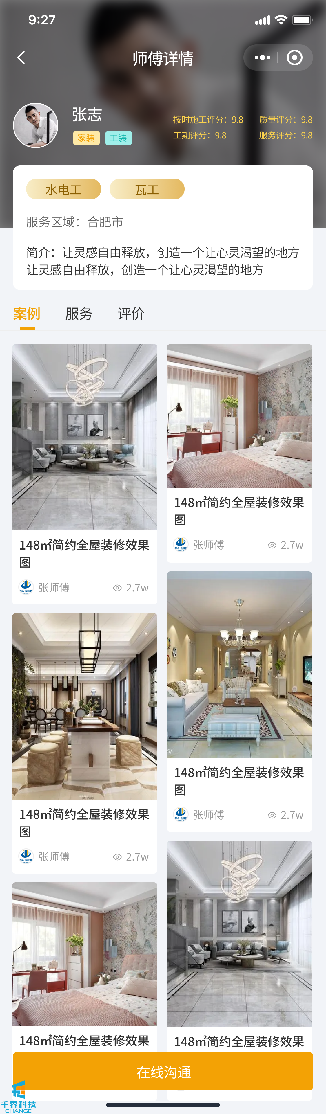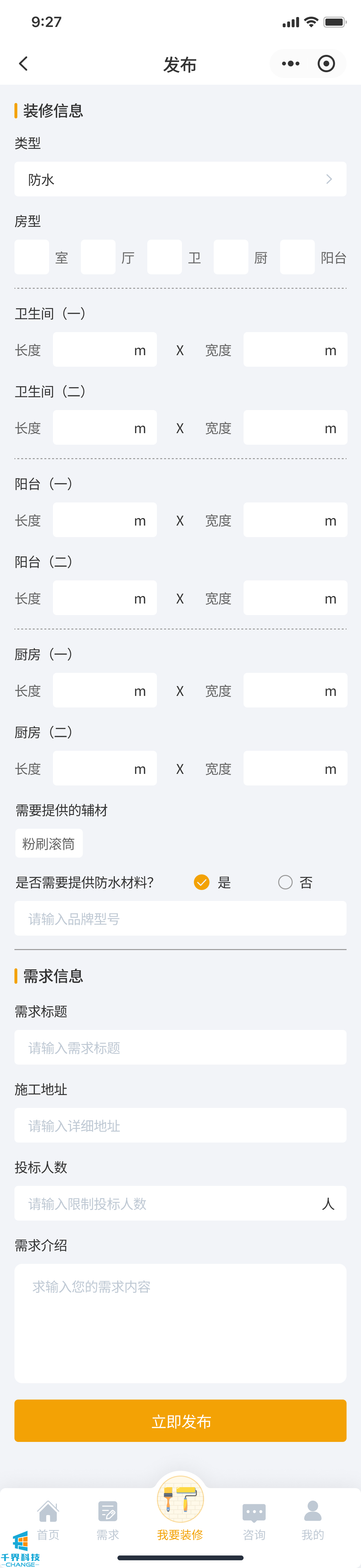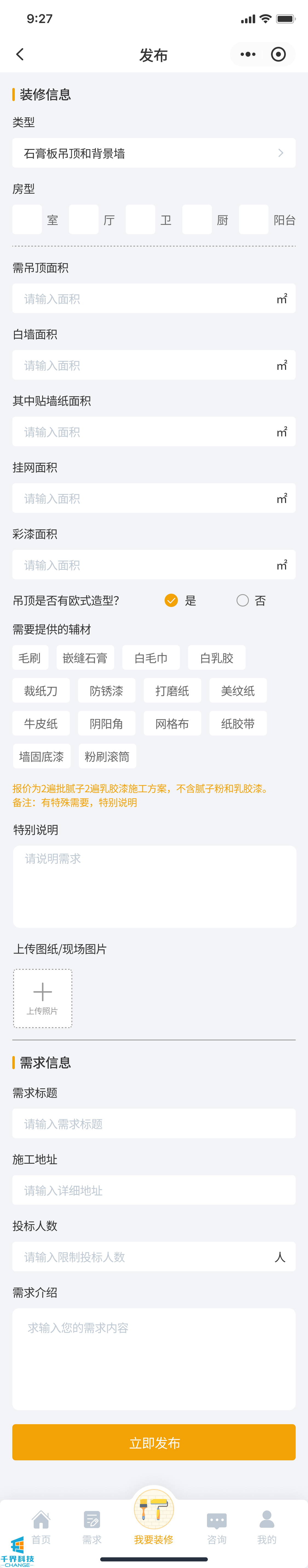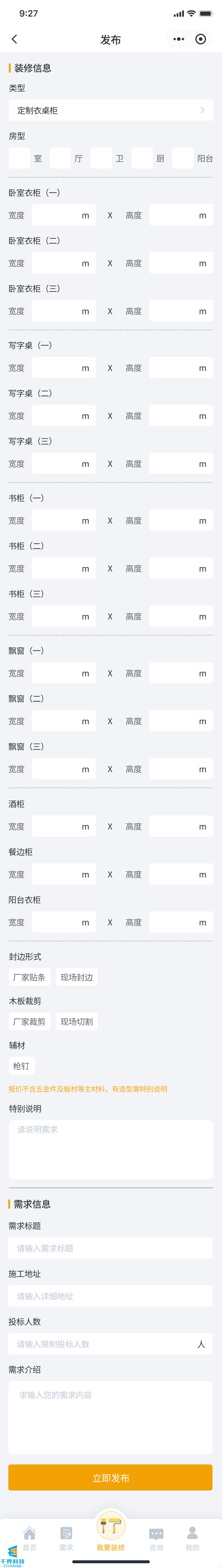 該項目是一個裝修小程序,用戶發布需求,師傅接單,師傅完工后用戶驗收評價,用戶也可以直接咨詢師傅下單,有即時通訊公告