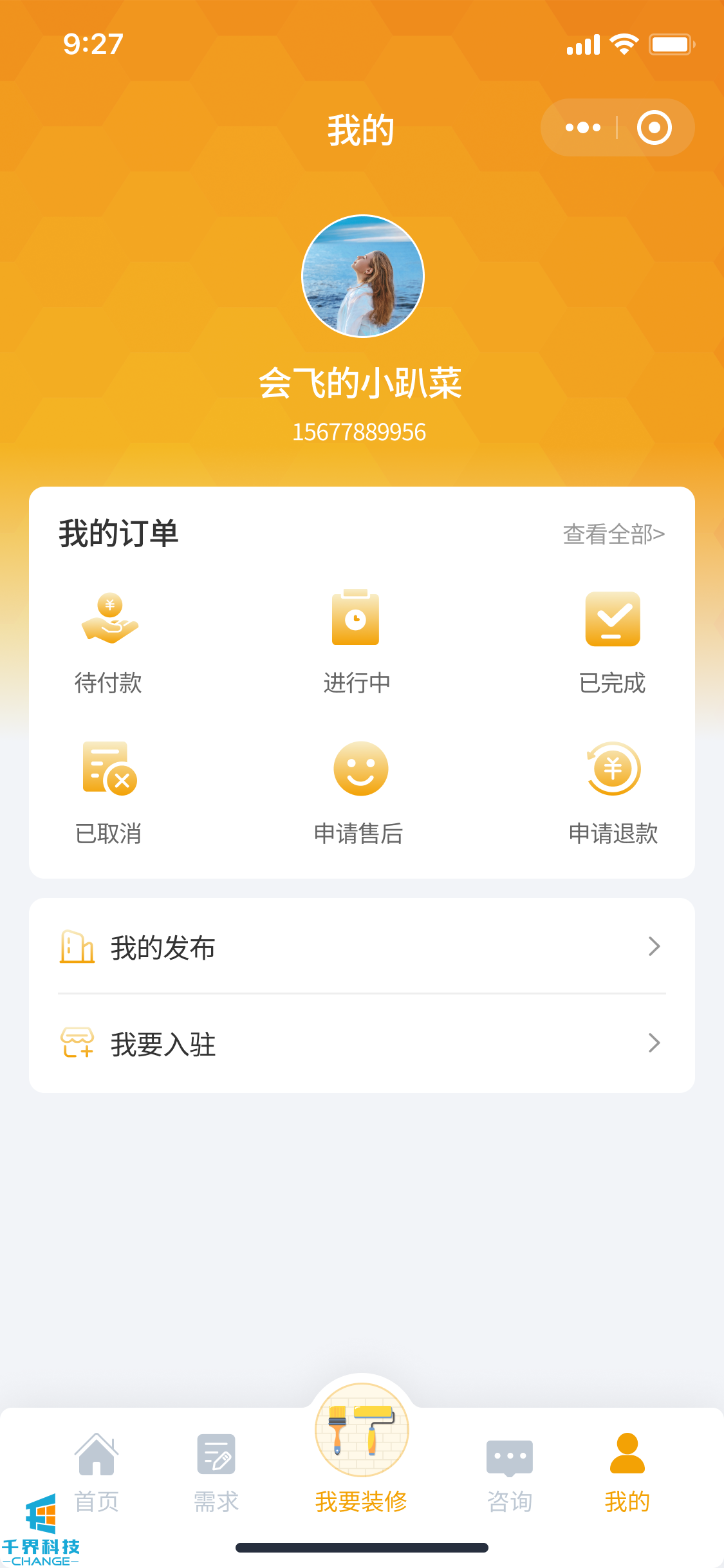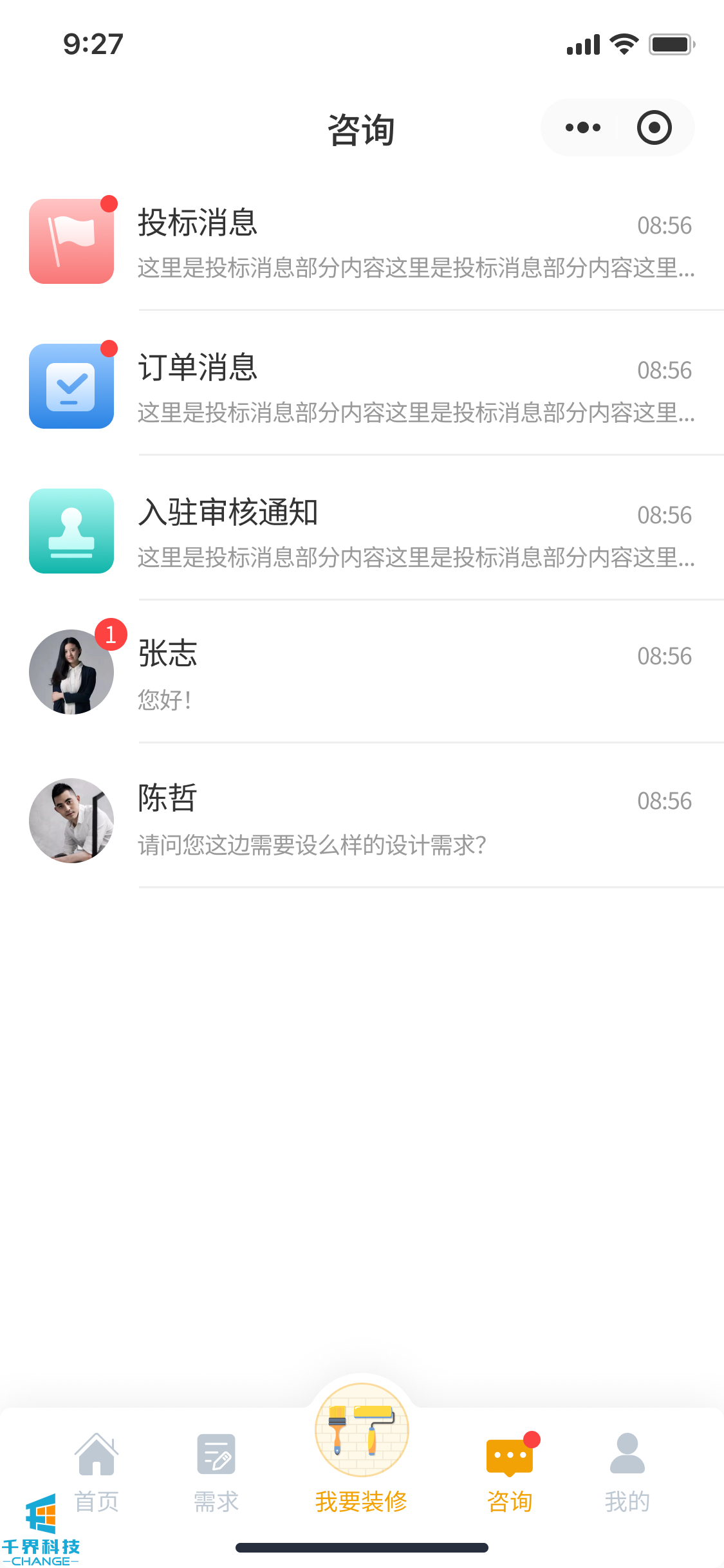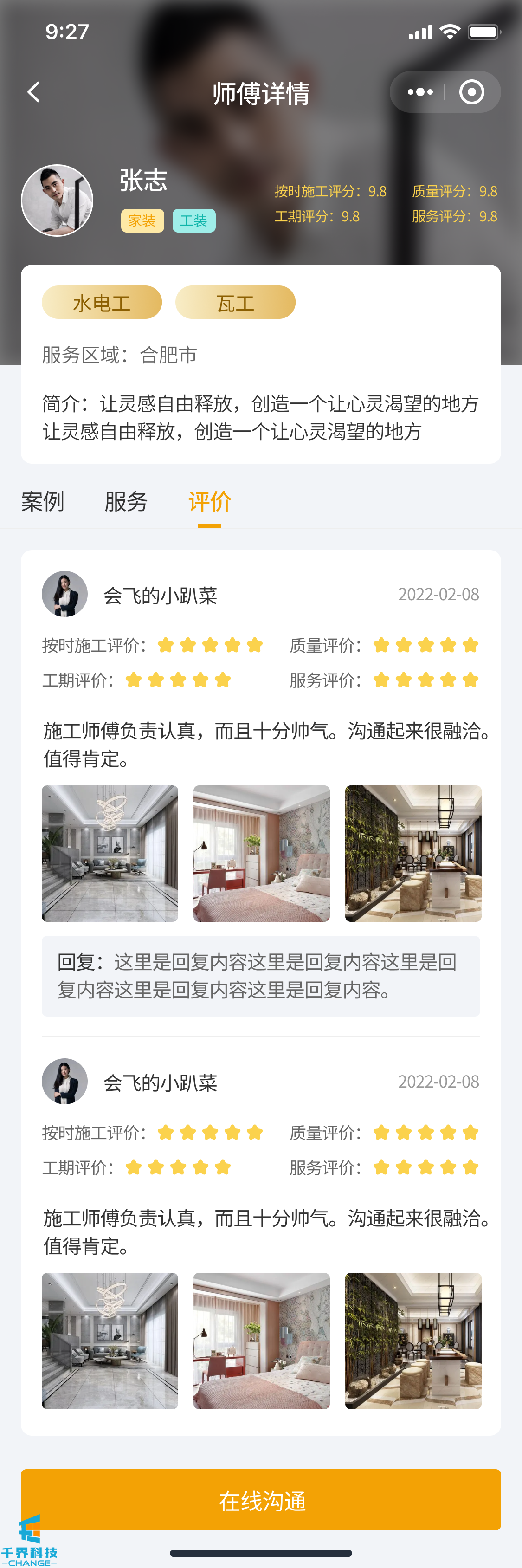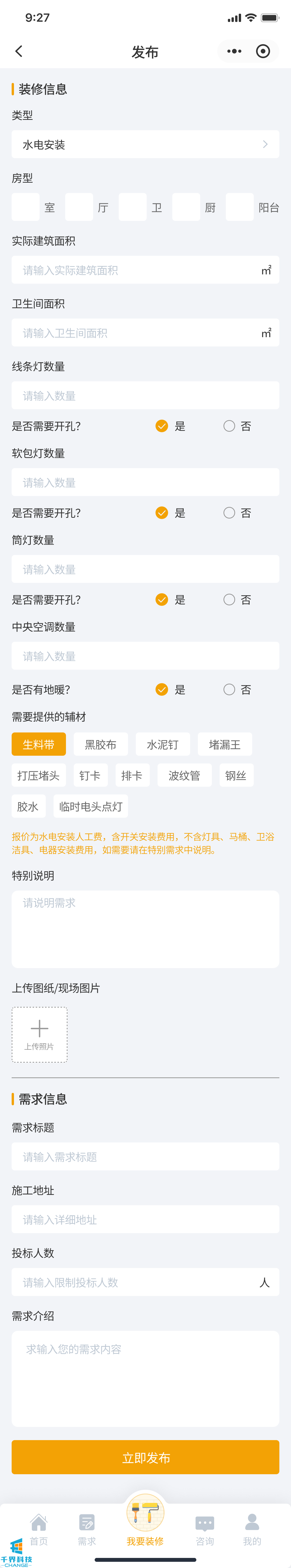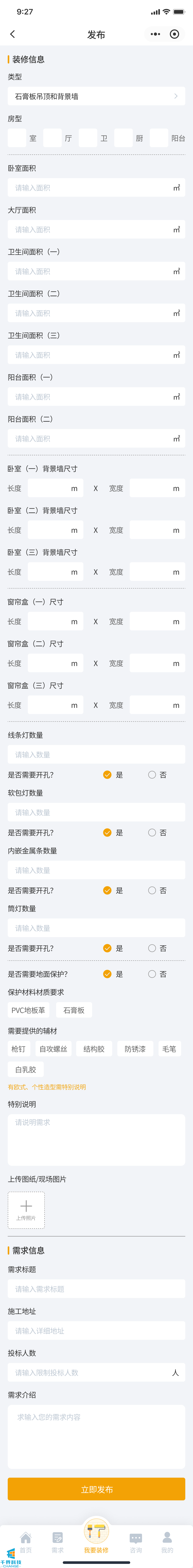 該項目是一個裝修小程序,用戶發布需求,師傅接單,師傅完工后用戶驗收評價,用戶也可以直接咨詢師傅下單,有即時通訊公告