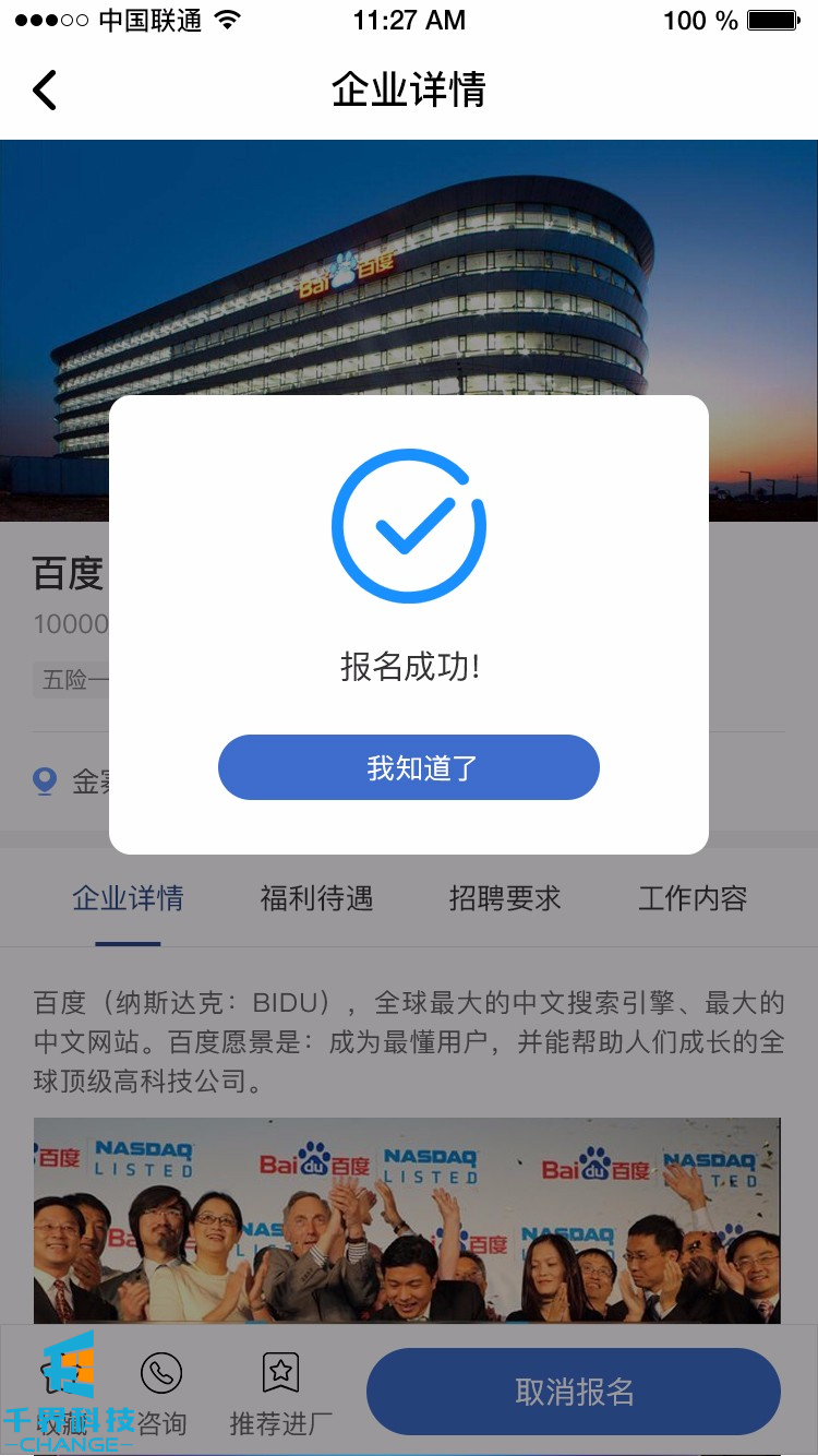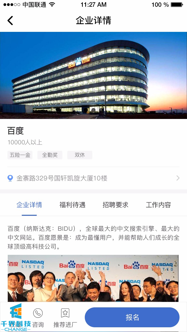 該項目是一個針對藍領招聘的app。里面包含崗位發布,在線招聘,會員繳費,推薦分銷,在線報名,崗位收藏,傭金結算,在線提現等功能。