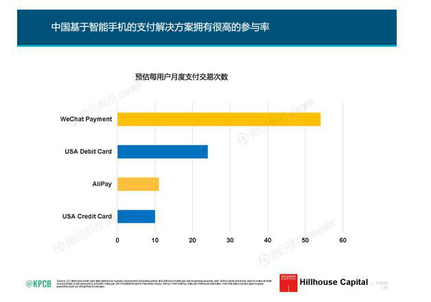 今年6月初,有“互聯網女皇”之稱的瑪麗?米克在其發布的《2016年互聯網趨勢報告》中,對微信支付和支付寶在內的多款支付產品月度支付次數進行了預估對比: