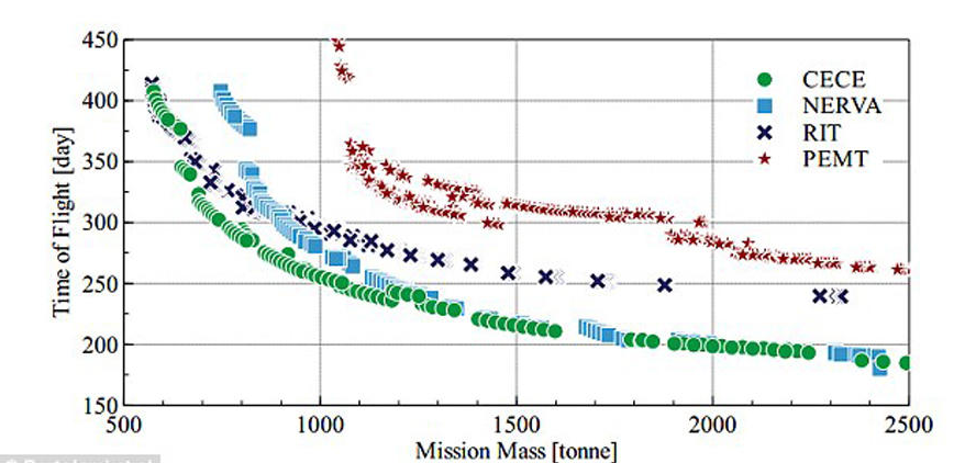 當然這是基于當前火箭技術的考量,如果美國宇航局在2030年代還無法使用更先進的推進系統,比如核動力火箭,那么登陸火星無疑將花費很長時間。因此Bertolami博士認為在未來十多年的時間內美國宇航局如果沒有能力實現核動力火箭的研制,那么2030年登陸火星不太可能實現。圖中顯示的為不同推進系統的載荷與時間曲線,從中可以看出藍色的核電推進效率很高,可攜帶更多的載荷,飛行時間也更短。