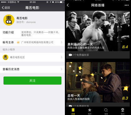 左為公眾號介紹頁;右為公眾號主體開發的小程序