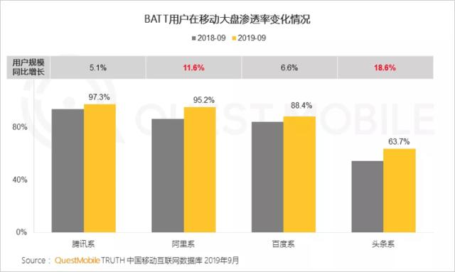 QuestMobile此前發(fā)布的《2019中國移動(dòng)互聯(lián)網(wǎng)秋季大報(bào)告》顯示,BAT依然是用戶體量最大的三個(gè)互聯(lián)網(wǎng)公司,三家用戶規(guī)模均超過10億,其他互聯(lián)網(wǎng)公司則遠(yuǎn)低于這一水平。而百度三季度財(cái)報(bào)則顯示,9月百度App日活躍用戶達(dá)1.89億,同比增長25%。