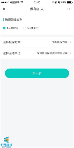 7.保單加人: ①用戶首先選擇職業類別,1-4類職業/5-6類職業(含高空) ②當用戶選擇1-4類職業時,下一步需選擇投保方案,例如30萬/50萬/80萬(后臺設定,不同的方案每天的扣費也不同),然后選擇派遣單位,添加投保人員,用戶可選擇手動錄入投保人員姓名(點擊輸入框時,之前已錄入的人員名單自動顯示出來,顯示姓名、身份證號碼,可直接進行選擇)、身份證號碼,也可上傳投保人員身份證照片,系統自動識別,獲取身份證照片上的姓名、身份證號碼(需對接三方身份證識別接口)。(PC端可用excel表格導入人員信息,姓名、身份證號碼) ③當用戶選擇5-6類職業時,彈框提示請聯系客服制定投保方案,顯示客服人員電話,可一鍵撥打。(客服電話同專屬客服) | ||