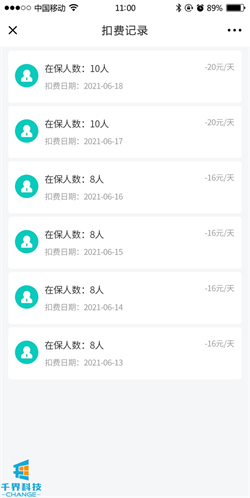 5.扣費記錄:用戶賬戶每天的所有在保人員扣費總金額流水列表展示 | ||