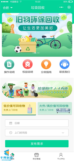 | 回收中心 | 1.我的小區: 顯示小區名稱、解綁按鈕 添加小區按鈕,點擊進入單頁面(單頁面選擇,按照距離進行展示、可搜索,可申請成為小區的回收員,需要后臺審核) 2.我的資料 申請成為回收員時填寫的資料,可修改資料,需要后臺審核 3.我的接單 狀態:待上門、已完成 顯示訂單號、標題、發布人昵稱、發布人所在小區(公司的話顯示所在地址) 點擊進入訂單詳情頁:可查看訂單號、標題、描述、發布人昵稱、發布人所在小區(公司的話顯示所在地址)、發布人電話 4.我的回收 掃一掃后支付后形成的訂單 | |