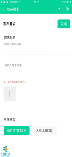 發布需求詳情頁: 1.標題:填寫文字信息 2.描述:文字描述 3.添加圖片 4.發布按鈕 | ||